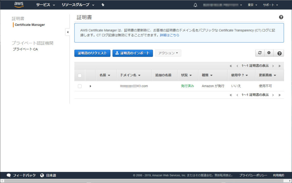 Amazon AWS 内のサービスで利用できる ACM(AWS Certificate Manager) で無料の SSL 証明書を発行してみます。