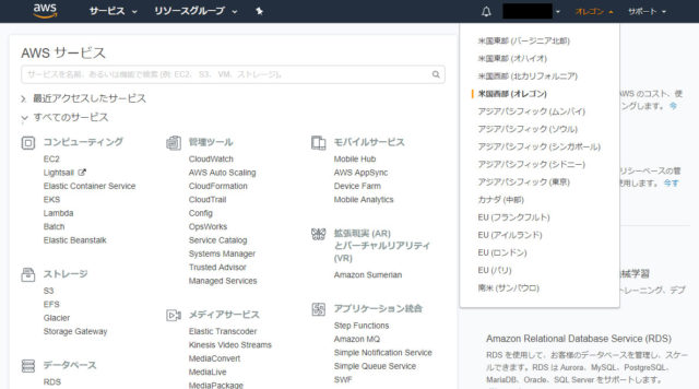 AWS のサービスを作成するにあたり、日本向けサービスのときは、距離の近い日本(東京)。または費用が安い米国東部(バージニア北部)か米国西部(オレゴン)を選択することが多いです。