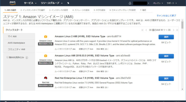最初にインスタンスのOSを決めます。今回は「Amazon Linux」を選択しますが、選択するOSの目安として別記事がありますので興味があればご参照ください。