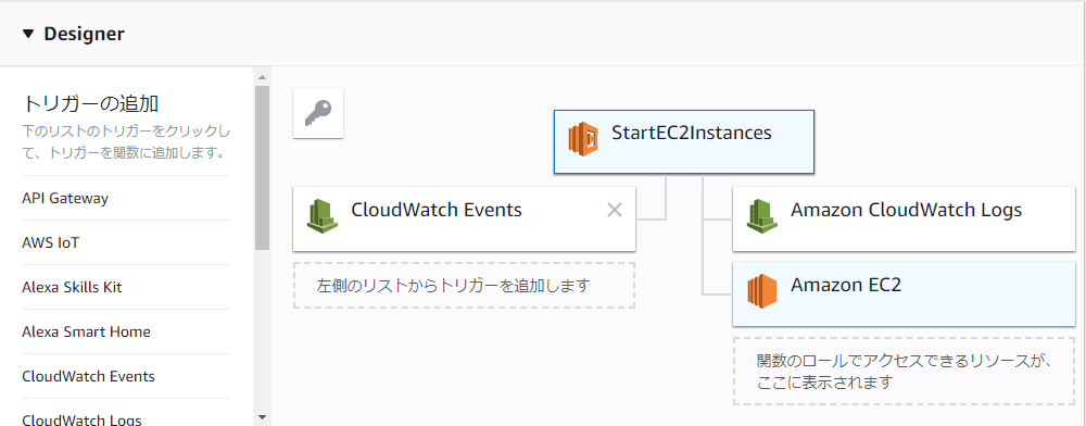 時間による自動起動を設定するため、左メニューにある「トリガーの追加」から「CloudWatch Events」をクリックしてトリガーを追加します。